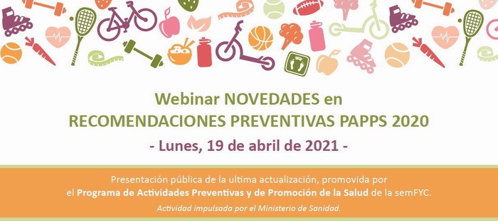 El Programa de Actividades Preventivas y de Promoción de la Salud (PAPPS) de la Sociedad Española de Medicina de Familia y Comunitaria (semFYC) y el Ministerio de Sanidad celebrarán el 19 de abril de 2021 el Webinar Novedades en recomendaciones preventivas PAPPS 2020, donde se presentarán las nuevas recomendaciones preventivas PAPPS 2020 publicadas en la revista Atención Primaria y que se pueden consultar en https://papps.es/resumen-recomendaciones-2020/. Se abrirá en una ventana nueva.