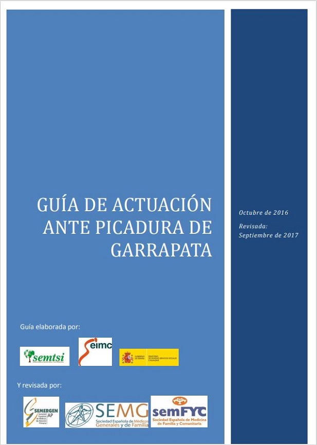 La Guía de actuación ante picadura de garrapata, publicada en octubre de 2016 por el Ministerio de Sanidad junto a varias sociedades médicas españolas, proporciona recomendaciones para la atención clínica tras una picadura, con especial énfasis en la importancia de vigilar el desarrollo de posibles enfermedades transmitidas por garrapatas. Incluye tablas y esquemas sobre las principales enfermedades transmitidas por garrapatas en España, sus vectores, periodos de incubación y manifestaciones clínicas, así como un algoritmo de actuación para la práctica clínica.