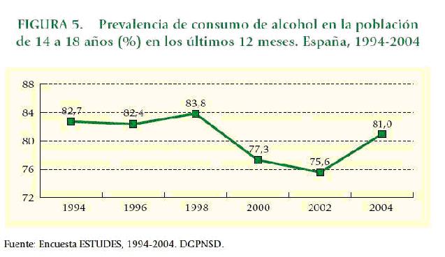 Las Encuestas Estatales sobre Uso de Drogas en Enseñanzas Secundarias (ESTUDES), también conocidas como Encuesta Escolar, dirigidas a estudiantes de 14 a 18 años, realizadas por la Delegación del Gobierno para el Plan Nacional de Drogas (DGPNSD), cuyos últimos datos publicados corresponden al año 2004, señalan que el alcohol sigue siendo la sustancia más consumida entre los jóvenes de estas edades.